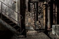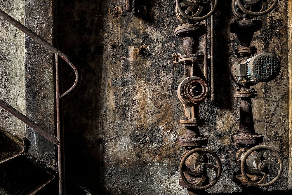 Trap en buizen in een verlaten papierfabriek in Frankrijk