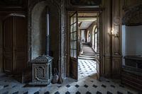 Koop de foto Trap en kachel in vervallen villa van Inge van den Brande als print op canvas, aluminium dibond, (ingelijste) fotoprint, behang en ArtFrame. Voor jou op maat geprint in Fine-Art kwaliteit.