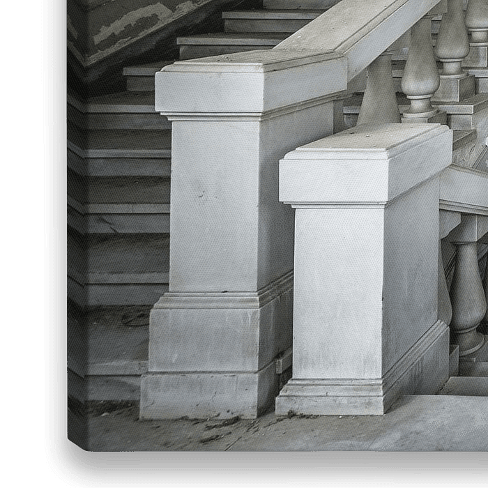 Rijkversierde natuurstenen trap in een grote villa. De indrukwekkende trap leidt naar de drie etages boven de grote hal. De grote ramen langs de trap zorgen voor een mooie lichtval. Het indrukwekkende gebouw staat al vele jaren leeg en is in staat van verval. Een geweldige ervaring om door zo'n immens groot en prachtig gebouw te lopen,…
