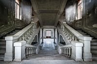Rijkversierde natuurstenen trap in een grote villa. De indrukwekkende trap leidt naar de drie etages boven de grote hal. De grote ramen langs de trap zorgen voor een mooie lichtval. Het indrukwekkende gebouw staat al vele jaren leeg en is in staat van verval. Een geweldige ervaring om door zo'n immens groot en prachtig gebouw te lopen, een gevoel van rijkdom, stijl en klasse.
