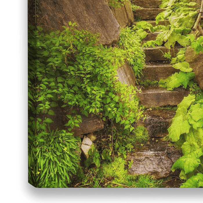 Een trap uit natuursteen begroeid met veel groen leidt naar een gietijzeren hek. De trap leidt naar het licht.