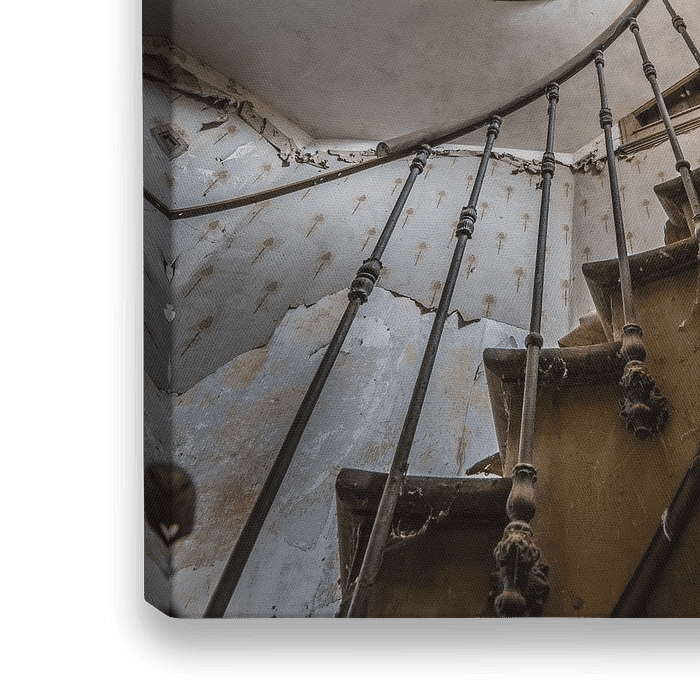 Een prachtige trap met fraaie spiraal in oude vervallen villa. We zien de mooie trap van onder naar boven, de spiraalvorm is hierdoor in zijn totaliteit te zien, tot aan het plafond op de bovenste verdieping van het gebouw. Een prachtige lichtval die naar boven toe steeds helderder wordt, en een heerlijk "Stairway to Heaven"…