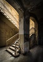 Trap in een prachtig vervallen gebouw. Het trappenhuis wordt mooi uitgelicht door het zonlicht dat van bovenaf naar binnenvalt. De rijk versierde trapleuningen laten de sporen van een rijk verleden zien. Nu is het gebouw ten prooi gevallen aan de tijd, het verval is ingetreden, en de verf bladdert overal van de muren.