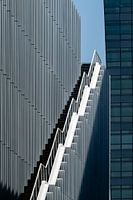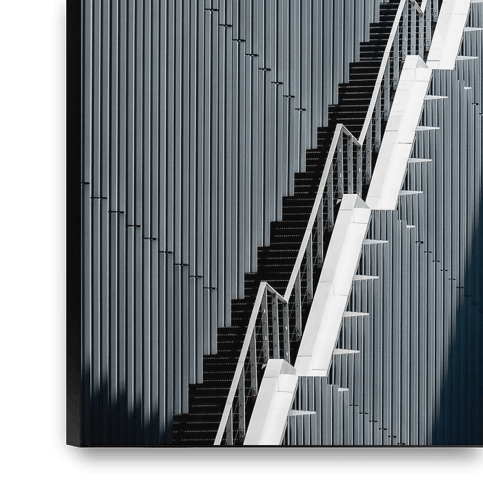 Dit kunstwerk, getiteld "Trap naar boven", vangt de essentie van moderne architectuur door middel van strakke lijnen en een dramatisch spel van licht en schaduw. De compositie wordt gedomineerd door een schijnbaar oneindige, diagonaal omhoog reikende buitentrap, die visueel contrasteert met de verticale, geribbelde gevel van een gebouw.…