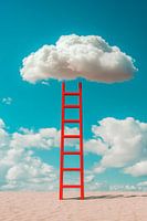 In het midden van een eindeloze zandvlakte rijst een felrode ladder op die rechtstreeks naar de wolken leidt. Deze fantasierijke structuur nodigt je uit om de grens tussen droom en werkelijkheid over te steken. Terwijl de helderblauwe lucht en zachte wolken een vredige achtergrond creëren, lijken mogelijkheden binnen handbereik.