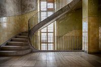 Trap met gele tegels en hoog raam in een verlaten gebouw