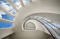 Abstracte weergave van de witte uitkijktoren trap bij het monument op de afsluitdijk tijdens een zonnige dag.