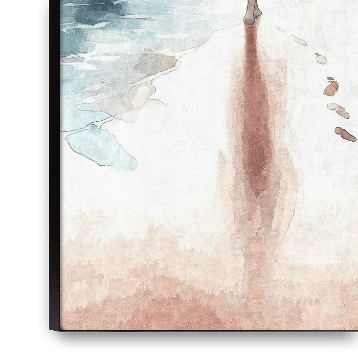 Een figuur stapt blootsvoets over het warme zand richting de zee - een motief vol vrede, vrijheid en innerlijke contemplatie. De zachte aquarellen, de zachte golven en het delicate silhouet creëren een meditatieve, poëtische sfeer. Deze afbeelding is perfect voor slaapkamers, wellnessruimtes of plaatsen die een ontspannen, natuurlijke…