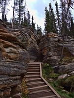 Een trap met houten treden leidt door een kleine kloof tussen uitgespoelde rotsen met zichtbare lagen gesteente in een bos bij de Athabasca Falls in Jasper National Park, Alberta, Canada in de Rocky Mountains op een bewolkte dag in de herfst.