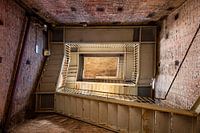 Trappenhuis in de beroemde Guinigi toren in Lucca, Toscane, Italië, een van de blikvangers van de stad en een must-go voor toeristen die dit middeleeuwse dorp bezoeken. Het trappenhuis is van onder naar boven gefotografeerd waardoor een mooi symmetrisch beeld ontstaat.