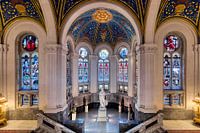 Symmetrisch beeld van het trappenhuis in het Vredespaleis in Den Haag, waarin het Permanente Hof van Arbitrage, het Internationaal Gerechtshof van de Verenigde Naties en de Haagse Academie voor Internationaal Recht zijn gehuisvest. Het Vredespaleis is het wereldwijde icoon van vrede en recht.