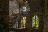 Een vervallen trappenhuis, met vensters en graffiti, in een verlaten fort in België