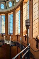 Trappenhuis van de oude Elbtunnel met de stalen trappen en statige ramen in metalen kozijnen en sponningen. De tunnel in de Duitse havenstad Hamburg is in 1911 geopend en is 426 meter lang en 24 meter onder water.