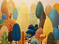 Tree Dreams - Dit kleurrijke abstracte schilderij toont een levendige verzameling bomen in verschillende vormen en tinten, die zorgen voor een vrolijke en speelse uitstraling in een modern interieur.