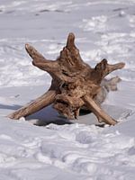 A tree root in the shape of a star in winter.
