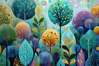 Tree Vibes - Dit kleurrijke natuur schilderij staat vol met levendige bomen en bladeren in diverse vormen en tinten, wat een speelse en vrolijke sfeer creëert in deze biophilic kunststijl.