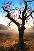 Sun shining behind the oak tree during misty autumn morning