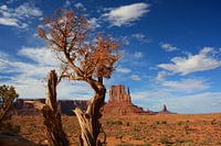 Monument Valley, maar dan vanuit een ander dan gebruikelijk standpunt. De boom benadrukt hoe desolaat en onwerkelijk dit landschap is.