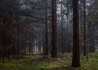 Bomen in een rij op een regenachtige herfstochtend in de 'Ballonzuilbossen' in de buurt van Merselo (Venray, Noord-Limburg).