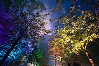 gekleurde lichten verlichten de bomen met op de achtergrond vuurwerk