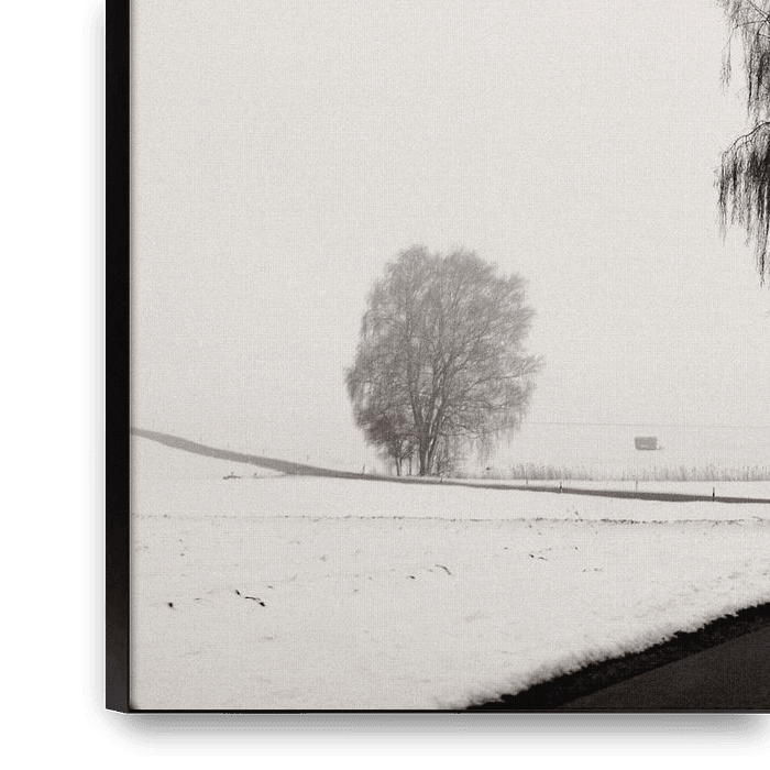 Fotografie einer winterlichen Landschaft mit Straße und Baum im minimalistischen Stil in schwarz-weiß.