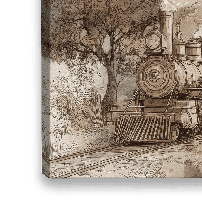 Trefwoorden: vintage illustratie, nostalgisch schilderij, tijdloze wanddecoratie, speelse kunst, Peter Pen tekeningen en schilderijen, retro wanddecoratie, charmant schilderij, trein, reizen, stoomlocomotief, berglandschap, klassieke wandkunst, landelijke kunst, woonkamer, hal, eetkamer, kantoor, vintage interieur, klassiek interieur, landelijk interieur
