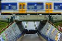 Foto van een Sprinter van de Nederlandse Spoorwegen die over een viaduct rijdt. De trein is vervaagd door beweging.