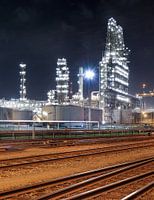 Scène met trein rails en verlichte petrochemische fabriek in de nacht, Haven van Antwerpen