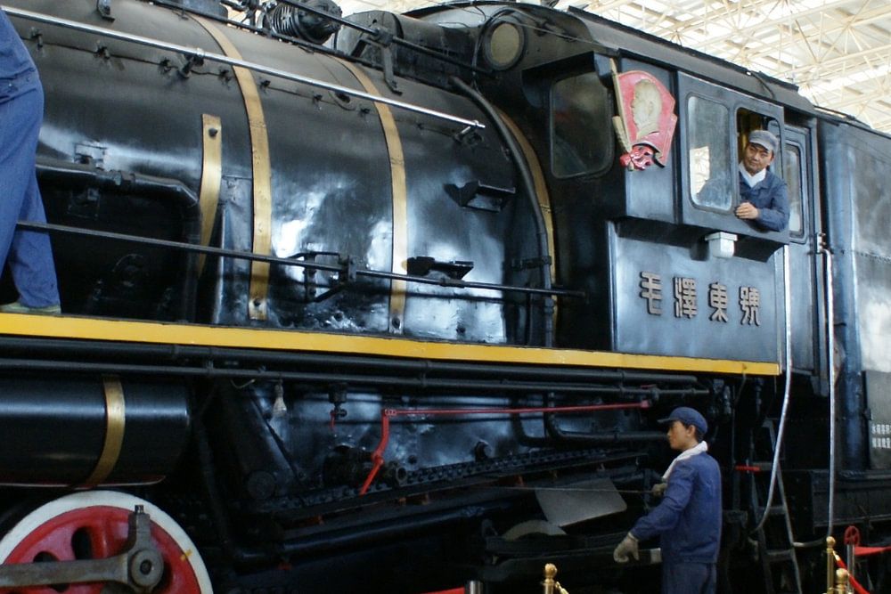 Foto 2 uit de serie: historische persoonlijke Oosten Wind (Dong Feng) Trein van Voorzitter Mao Zedong zoals die te zien is het in het Nationale treinmuseum van China in Noord Beijing. De foto geeft een 45 graden hoekzicht op de locomotief en parate bemanning.