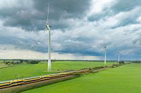 Intercitytrein van de Nederlandse Spoorwegen rijdt in een lentelandschap met windturbines die duurzame energie produceren op de achtergrond