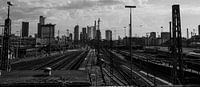 Een prachtige zwart wit foto van het spoor en wolkenkrabbers in de verte in Frankfurt am Main in Duitsland.