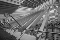 Detailopname van railing met klok binnenin treinstation Luik - Guillemins België in zwart wit.