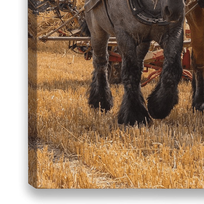 Démonstration de la récolte du blé avec des chevaux de trait triples.