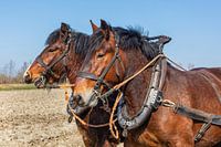 Voorjaarswerkzaamheden op een akker bij Kwadendamme van De Stichting Het Werkend Trekpaard Zeeland. De akker wordt bewerkt op authentieke manier met oude machines en met trekpaarden, hier wordt de geploegde akker klaar gemaakt om te bemesten en aardappels te poten.