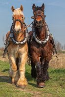 Trekpaarden aan het werk op een akker met voorjaarswerkzaamheden.