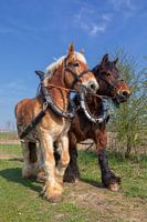 Trekpaarden aan het werk op een akker met voorjaarswerkzaamheden.