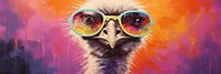Trendy Struisvogel | Kleurrijk Dierportret - Dit levendige schilderij toont een struisvogel met kleurrijke, fluorescerende zonnebrillen die een onverwacht en speels element toevoegen. De achtergrond is een dynamische mix van oranje en paars, met verftechnieken die de compositie diepte en beweging geven.