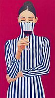 Dit doek toont een rustige vrouw met ogen dicht. Een hand tilt een glas wijn tot mondhoogte. Een trui met patroon in kleur blauw en kleur wit omsluit hals en romp.