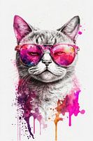 Een stijlvolle kat in zwart-witte lijnen draagt een opvallende roze zonnebril en straalt een nonchalante houding uit. Het moderne ontwerp combineert op speelse wijze natuur en mode.
