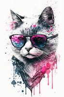 Een stijlvolle kat in zwart-witte lijnen draagt een opvallende roze zonnebril en straalt een nonchalante houding uit. Het moderne ontwerp combineert op speelse wijze natuur en mode.