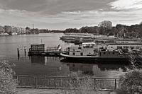 De foto toont de haven met de aanlegsteiger voor rondvaartboten en schepen direct bij het Treptower Park. De herfstverlichting lijkt zacht en harmonieus. Het weidse, rustige uitzicht tot aan de Rummelsburgbaai geeft een meditatieve sfeer aan het stedelijke stadsmotief aan de oevers van de rivier de Spree.