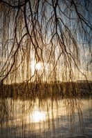 Treurwilg aan de Baldeneysee in tegenlicht bij zonsondergang en silhouet