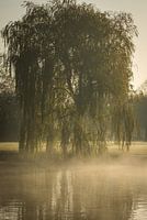 De treurwilg in de mist bij de vijver in de vroege ochtend.