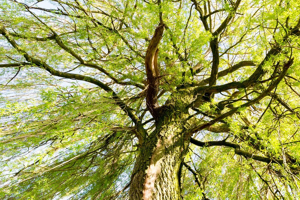 Wilgenboom onderkant met takken die uitlopen in voorjaar. In de lente heb ik deze wilg van onder gefotografeerd. De takken en twijgjes lopen net uit met verse nieuwe bladeren. Tussen de takken door zie je de blauwe lucht.