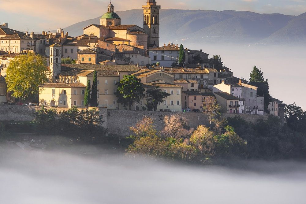 Over "Trevi-dorp in een mistige ochtend. Umbrië, Italië"