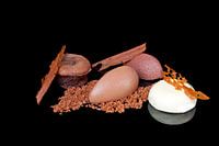 Overheerlijk nagerecht bestaande uit bruine melk en pure chocolademousse als een quenelle gepresenteerd, witte chocolademousse en een chocolade-macaron. Gesoigneerd met crunchy chocolade en een decoratieve tuille.