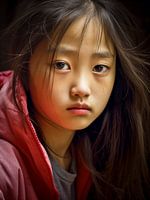 Een jong meisje met lang donker haar kijkt bedroefd in de camera, haar uitdrukking is beschouwend en licht melancholisch. Het gouden licht van de ondergaande zon verlicht haar gezicht en werpt een warme gloed op haar huid. Haar rode jas voegt kleur toe aan het beeld en contrasteert met de zachte tinten van haar omgeving.