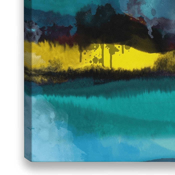 Abstracte aquarel met een levendige mix van oranje, gele, paarse, blauwgroene, blauwe en grijze tinten. De kleuren wisselen elkaar zachtjes en dramatisch af in de compositie, waardoor een gevoel van atmosferische diepte ontstaat. Het schilderij toont een abstracte weergave van landschapselementen die doen denken aan heuvels of bergen…