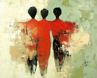 Trio Rood - Dit abstracte schilderij toont drie gestileerde menselijke figuren in een dominante rode tint tegen een rustgevende achtergrond van verzachtende beige en groene kleuren, die een gevoel van kalmte en samenhorigheid uitstralen.