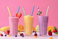 Op deze aantrekkelijke foto worden drie kleurrijke fruitshakes gepresenteerd in stijlvolle glazen, perfect naast elkaar. Elke shake schittert in levendige kleuren - van lichtroze tot felgeel en zachtpaars. De glazen zijn gegarneerd met vers fruit en versierd met kleurrijke rietjes, wat de foto een vrolijk tintje geeft.